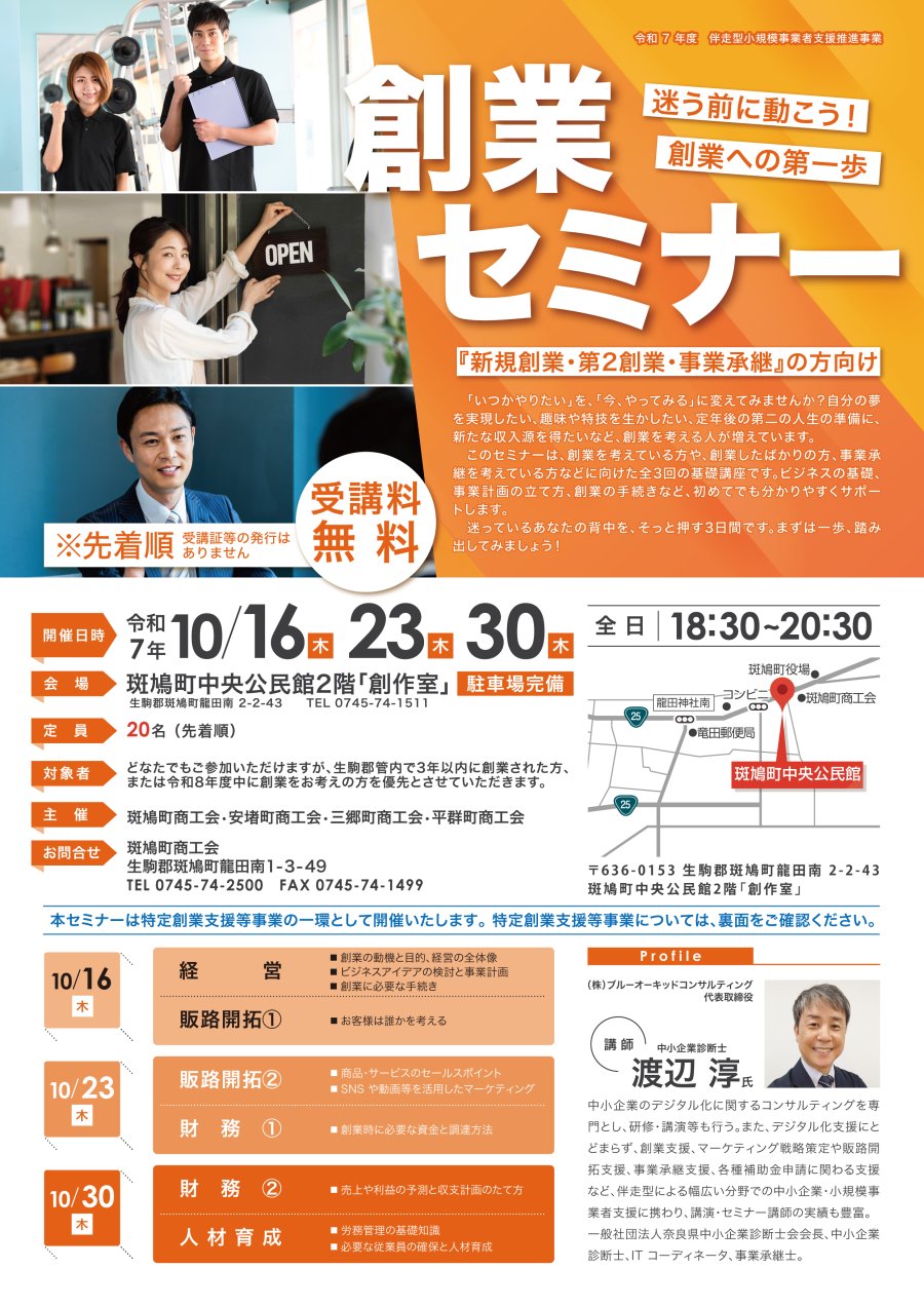 斑鳩町商工会では、安堵町、三郷町、平群町の各商工会と連携してチラシの通り「創業セミナー」開催します。