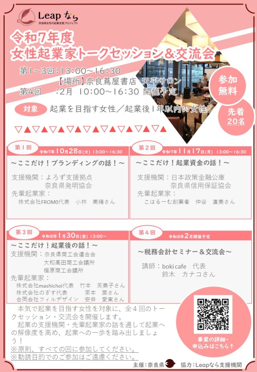 奈良県では、今後、起業を目指されている女性や起業後間もない女性経営者の方を対象とした「女性起業家トークセッション&交流会」をチラシの通り開催されますのでご案内いたします。