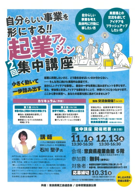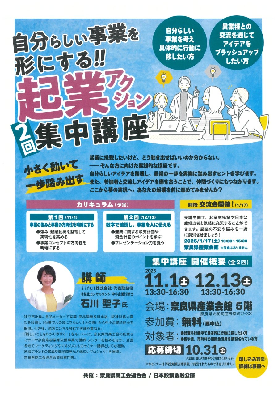 奈良県商工会連合会では、この度、別紙チラシの通り「起業アクション集中講座」を開催いたしますのでご案内いたします。(共催 日本政策金融公庫)